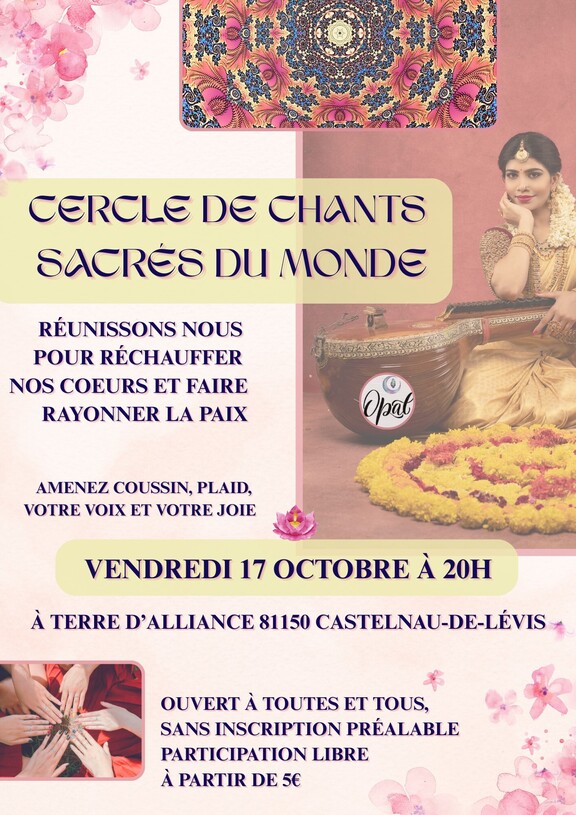 La soirée se vit assise, en cercle (amenez ce qui vous permettra d'être confortable : tapis, coussin, couverture... voire petit tabouret ou chaise pliante si difficulté à s'asseoir au sol). Les chants sont issus de différentes traditions spirituelles en différentes langues. Nous faisons ce choix afin de créer des ponts entre les humains et cultiver l'unité qui nous caractérise, au-delà des croyances et pratiques personnelles : nous proposons un temps de reliance au nom de l'amour.