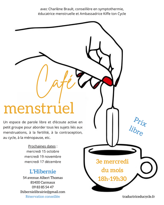 Charlène Brault, conseillère en symptothermie, éducatrice menstruelle et ambassadrice Kiffe ton Cycle, je vous accueille chaque 3e mercredi du mois de 18h à 19h30 à l'espace salon de thé de la librairie L'Hibernie, à Carmaux (81400).