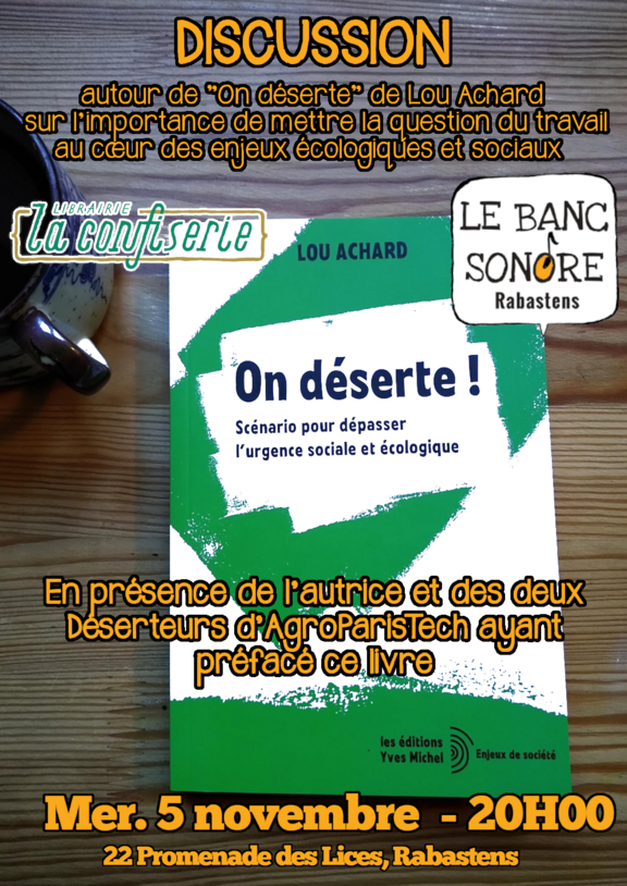 S'il met l'accent sur les appels révélateurs d'une nouvelle génération, ce livre préfacé par deux Déserteurs d'AgroParisTech étend rapidement la problématique à toute une population à bout de souffle. À travers des leviers concrets, cet essai s'appuie sur les rapports de force en présence, pour former les contours d'un possible scénario de désertion collective... (?) (En présence de l'autrice, de Théophile Duchâteau et Victor Lebeau, ''Déserteurs'' du discours d'AgroParistech).