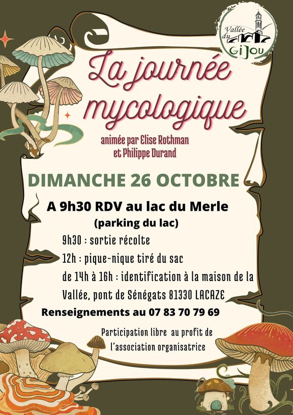 Participez à une journée mycologique animée par Élise Rothman d'Hauthuille, auteure du livre *Ce champignon est-il comestible ?*, et par M. Philippe Durand, président de la Société des sciences naturelles du Tarn. Le rendez-vous est fixé au lac du Merle pour une matinée de cueillette de champignons, suivie d'un déjeuner convivial (pique-nique tiré du sac) et d'un atelier pratique d'identification.