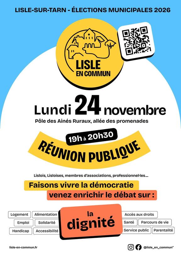 Lundi 24 novembre, Lisle en commun vous invite à la réunion publique sur l'axe "Dignité". On y parlera notamment de services publics, d'accès aux droits, de lien social dans les hameaux, de logement, de bien vieillir, de soutien à la parentalité, de participation citoyenne, de lutte contre l'isolement et l'insécurité, d'accompagnement social...