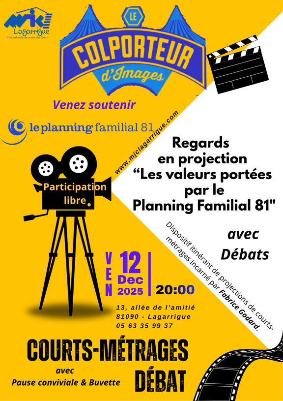 La MJC de Lagarrigue a le plaisir d'accueillir le Colporteur d'Images pour une soirée spéciale : "Libres de nos choix pour nos valeurs et on luttera tant qu'il faudra pour nos actions", une sélection de courts-métrages autour des valeurs portées par le Planning Familial 81