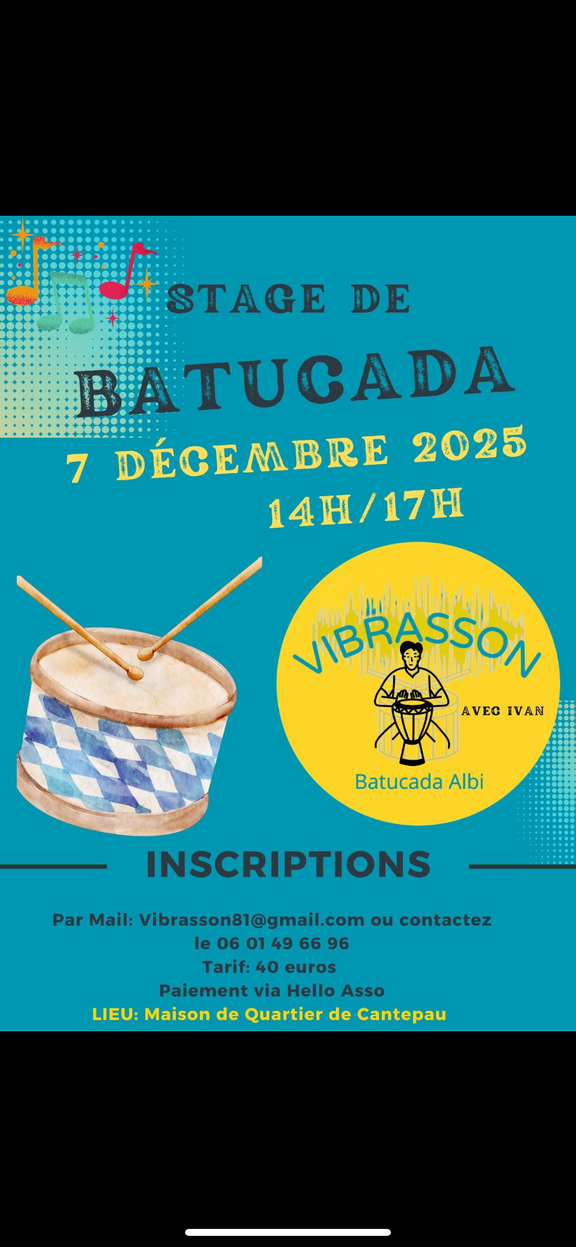 Stage de Batucada Albi le dimanche 7 décembre de 14hà17h au tarif de 40 e ( 30 e pour le cours et 10e d adhésion à notre association