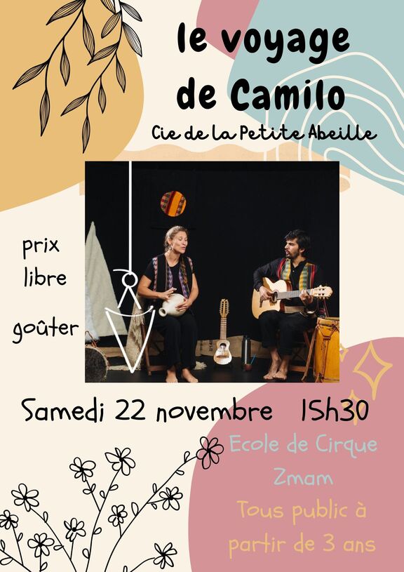 La Compagnie de la Petite Abeille vous propose de découvrir la musique traditionnelle Argentine et ses rythmes (zambas, chacareras, huaynos, vidalas,...). C'est un nouveau monde musical qu'on explore au travers de l'histoire du petit Camilo qui voyage au côté de son papa aux quatre coins de son pays, l'Argentine.