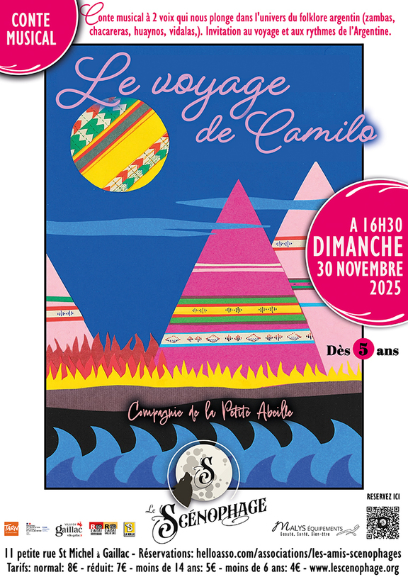 LE VOYAGE DE CAMILO, est un conte musical à 2 voix qui nous plonge dans l'univers du folklore argentin. Une invitation au voyage, un conte initiatique et un bain de sonorités d'ailleurs...