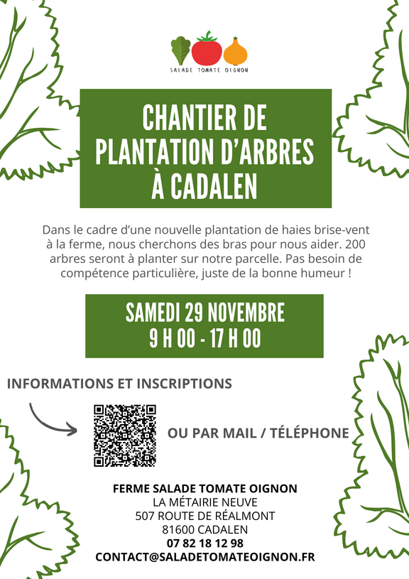 Dans la continuité de notre projet avec l'école de Cadalen et du dispositif "Des Enfants Et Des Arbres", nous organisons un chantier participatif pour planter des haies brise-vent autour de notre bassin et de nos serres. Les enfants de l'école de Cadalen vont planter des fruitiers quelques jours avant et on organise ce chantier en suivant pour continuer les plantations.