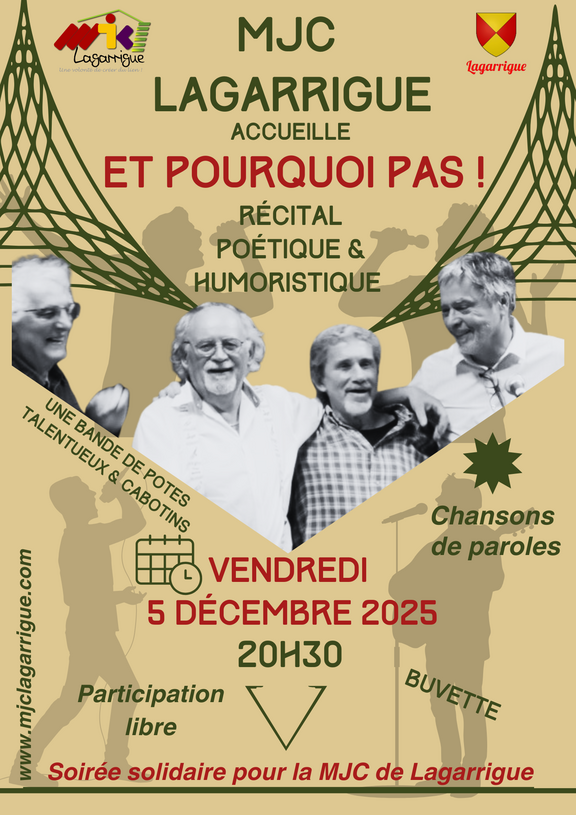 Le vendredi 5 décembre 2025 à 20h30, la MJC de Lagarrigue ouvre ses portes à une soirée pas comme les autres : une rencontre musicale et solidaire, portée par le groupe Et pourquoi pas!.