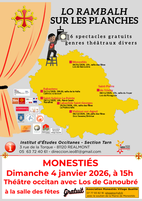 L'Institut d'Études Occitanes - Section Tarn et l'association Monestiés Village Qualité (MVQ) vous proposent un spectacle de théâtre avec Los de Ganoubre dans le cadre du projet Lo rambalh sur les planches financé par le Fonds de Développement de la Vie Associative.