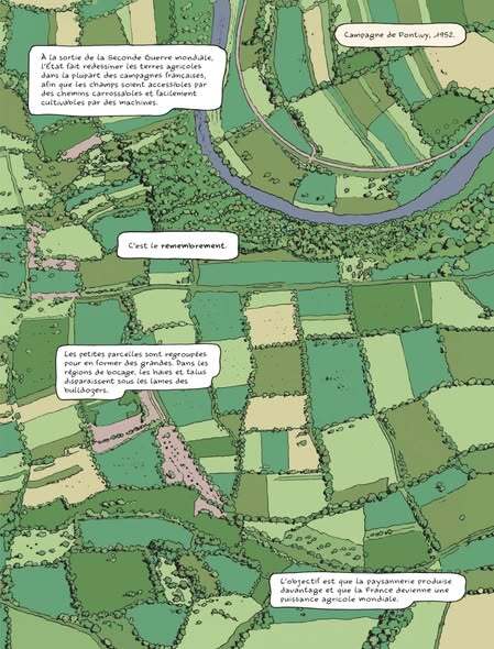La BD d'Inès Léraud et Pierre Van Hove, Champs de bataille - L'histoire enfouie du remembrement. La documentariste dévoile les coulisses d'une politique agricole majeure qui, dès les années 1950, a façonné la France moderne… tout en bouleversant paysages, savoir-faire et vies rurales.