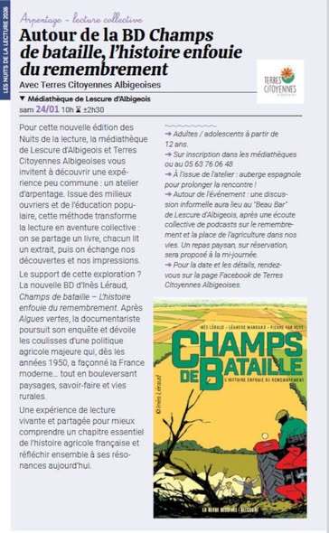 Pour la nouvelle édition des Nuits de la lecture en janvier 2026, la médiathèque de Lescure d'Albigeois des Médiathèques du Grand Albigeois et l'association Terres Citoyennes Albigeoises vous invitent à découvrir une expérience peu commune : un atelier d'arpentage.