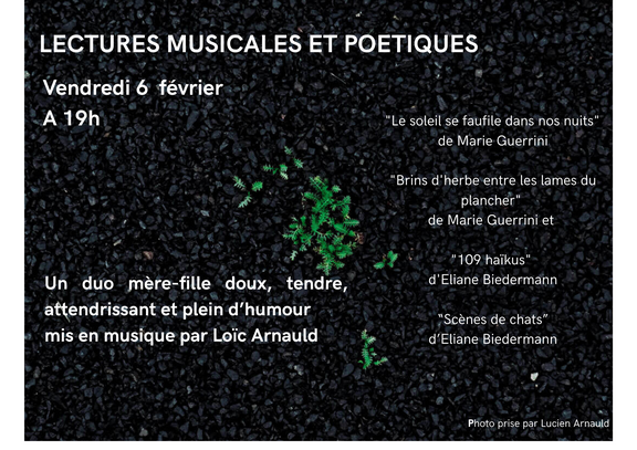 "Le soleil se faufile dans nos nuits" et " Brins d'herbe entre les lames du plancher" seront mis en parole par Marie Guerrini ; "109 haïkus" et "Scènes de chats" par Eliane Biedermann, accompagnées à la guitare par Loïc Arnauld.
