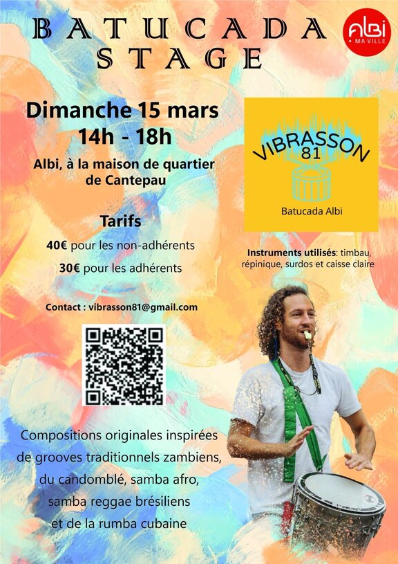 Stage de Batucada avec l'association Vibrasson d'Albi. Venez découvrir la batucada style samba reggae avec notre prof Ivan qui mène plusieurs batucadas depuis de nombreuses années.