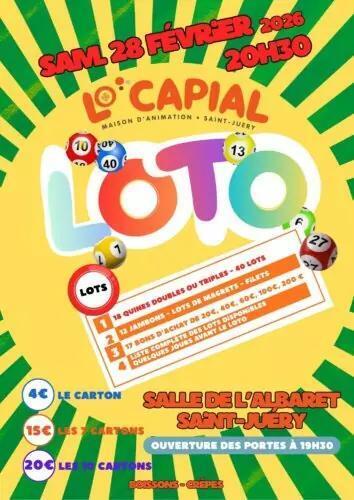 La Maison d'animation "Lo Capial" convie l'ensemble des habitants de SAINT JUÉRY et des villes environnantes à participer à son grand loto annuel. Il est organisé ce samedi 28 février à partir de 20 h 30 (ouverture des portes à 19 h 30) à la salle de l'Albaret.