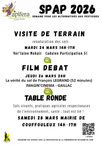 L'association APIFERA pour la connaissance et la préservation de la Nature organise à l'occasion de la SPAP 2026 (Semaine Pour les Alternatives aux Pesticides) 3 événements, en partenariat avec la Confédération Paysanne du Tarn.