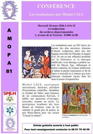 Je t'adresse une affiche concernant une conférence sur les Troubadours que j'organise
