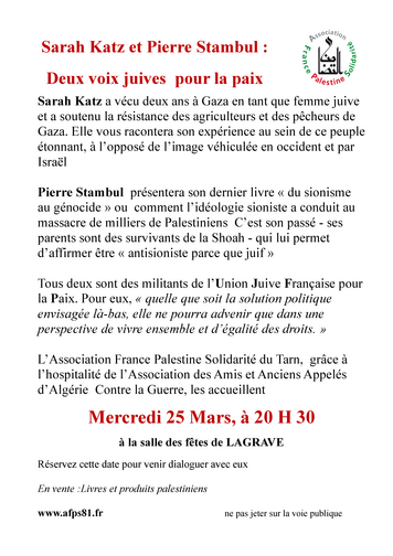 Pierre Stambul présentera son dernier livre « du sionisme au génocide » ou comment l'idéologie sioniste a conduit au massacre de milliers de Palestiniens C'est son passé - ses parents sont des survivants de la Shoah - qui lui permet d'affirmer être « antisioniste parce que juif »
