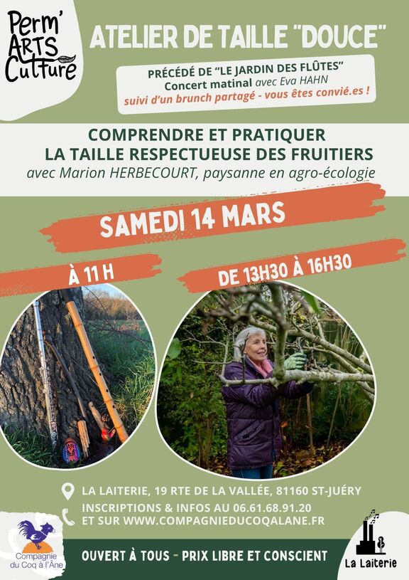 Première rencontre d'une action croisée Arts et Paysannerie, cette journée est consacré à l'accompagnement des arbres fruitiers par un atelier d'initiation, à l'écoute de l'environnement et de la musique par un concert solo en plein air, et aux échanges d'idées et de boutures lors d'un repas partagé.
