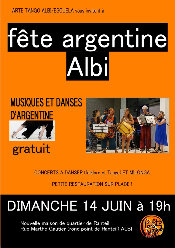 Nous fêtons la MUSIQUE Argentine et Amérique du sud et vous invitons à cet évènement qui clôture nos activités de l'année ! avec la participation de notre ensemble de folklore amérique latine, et la participation de notre orchestre-école Tango d'ALBI, en tout plus de 20 musiciens avec un répertoire de qualité , dépaysant, festif et dansant ! en présence des intervenants et directeurs musicaux : Marco GRANCELLI (guitariste folklore argentin, membre du Trio Tikismikis) et Marcelo MERCADANTE (bandonéoniste, compositeur et directeur du Quinteto Marcelo Mercadante de Barcelone)