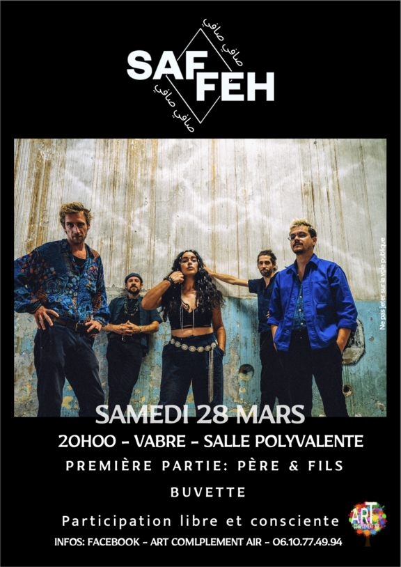 Nous sommes heureux de vous proposer pour la troisième année consécutive notre concert pour la sortie de l'hiver. Un « Blues festif du Berlou » vous attend en première partie avec Père & Fils, un duo que vous connaissez bien et pour lequel vous revenez toujours!! Rémi Mouillerac invite son fils Cédric au cajon et à l'harmonica pour vous faire bouger sur un répertoire fait de blues, de rock, de funk, de reggae, de compos comme d'impros… Suivi du groupe Saf Feh, quintet ultra énergisant de transe afro-rock, soudé autour de la présence magnétique et virevoltante de Sabrina et de sa voix. Le groupe porte haut les couleurs d'une musique nomade, métissée, empreinte de valeurs humanistes, de partage et de fête. Electricité mêlée à la musique arabe, poésie dans la soul et sensualité vous feront vibrer!!